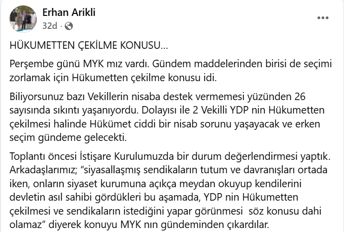 Perşembe günü MYK mız vardı. Gündem maddelerinden birisi de seçimi zorlamak için Hükumetten çekilme konusu idi.Biliyorsunuz bazı Vekillerin nisaba destek vermemesi yüzünden 26 sayısında sıkıntı yaşanıyordu. Dolayısı ile 2 Vekilli YDP nin Hükumetten çekilmesi halinde Hükümet ciddi bir nisab sorunu yaşayacak ve erken seçim gündeme gelecekti.Toplantı öncesi İstişare Kurulumuzda bir durum değerlendirmesi yaptık. Arkadaşlarımız; “siyasallaşmış sendikaların tutum ve davranışları ortada iken, onların siyaset kurumuna açıkça meydan okuyup kendilerini devletin asıl sahibi gördükleri bu aşamada, YDP nin Hükumetten çekilmesi ve sendikaların istediğini yapar görünmesi söz konusu dahi olamaz” diyerek konuyu MYK nın gündeminden çıkardılar.